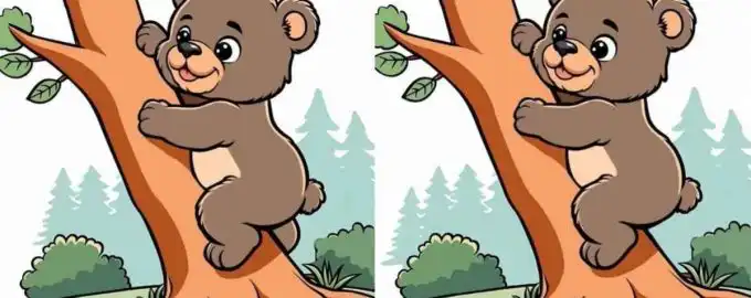Det här är ett klassisk ”hitta skillnaderna”-pussel med en twist: en klättrande björn i ett träd. För att klara utmaningen på 13 sekunder krävs