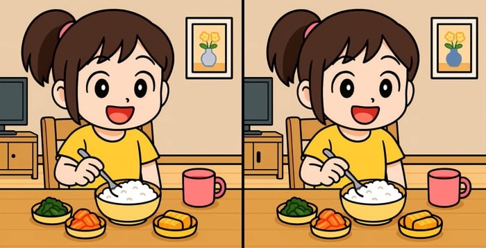 Den andra skillnaden sitter på bordet. Kolla på brödet eller frukten i skålen framför flickan. På ena bilden har detta föremål en annan form eller orientering jämfört med den andra.