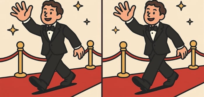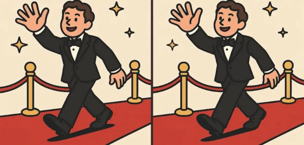 Kan du hitta tre små skillnader mellan två nästan identiska bilder av en man på en röd matta? Tiden tickar – 91 sekunder på dig. Nyckeln är att skanna bilderna systematiskt, inte slumpmässigt.