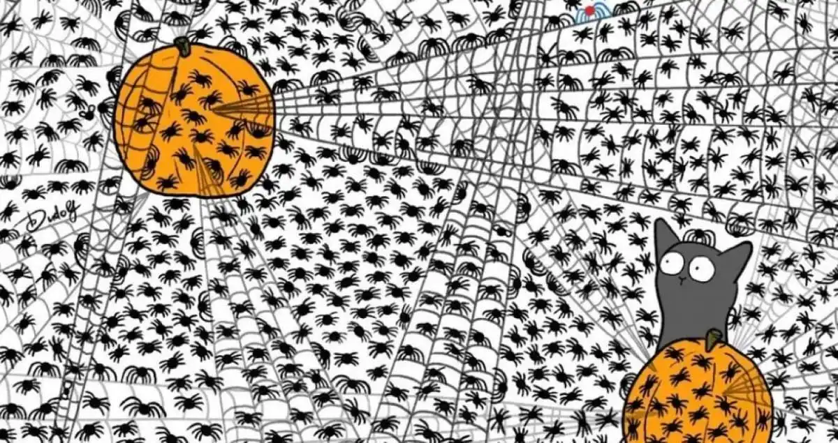 Du står inför en riktig hjärngympa! Illustrationen av den berömda konstnären Gergely Dudás är ett mästerverk i visuell förvirring. På första anblicken ser du ett stort, vitt spindelnät prytt med fyra glada pumpor och vad som verkar vara hundratals små, svarta spindlar. Men ditt mål är inte spindlarna. Ditt mål är de sju små flugorna som är perfekt gömda i kaoset. Tiden tickar – du har bara 11 sekunder på dig. Känner du dig redo för utmaningen? Stoppa klockan och försök!
