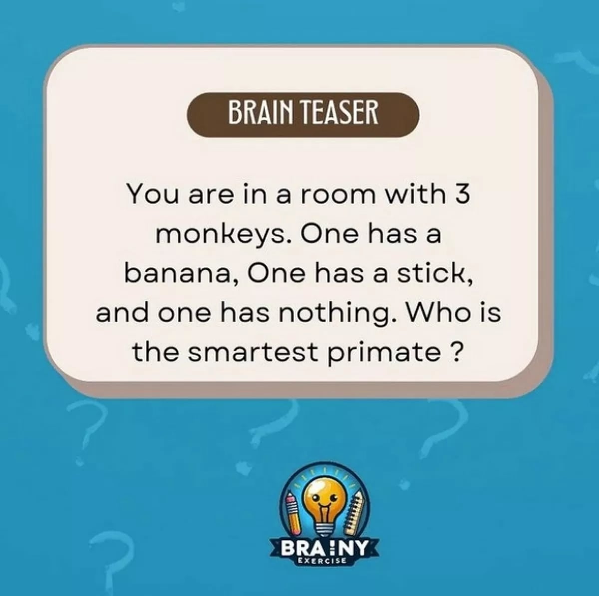Du ställs inför en klassisk hjärnvrängare som ser enkel ut vid första anblicken, men som snabbt får en att tvivla. I ett rum finns tre apor. Den första apan håller en banan. Den andra apan håller en pinne. Den tredje apan har ingenting alls. Frågan som får hjärnan att skrika är: Vem är den mest intelligenta primaten?