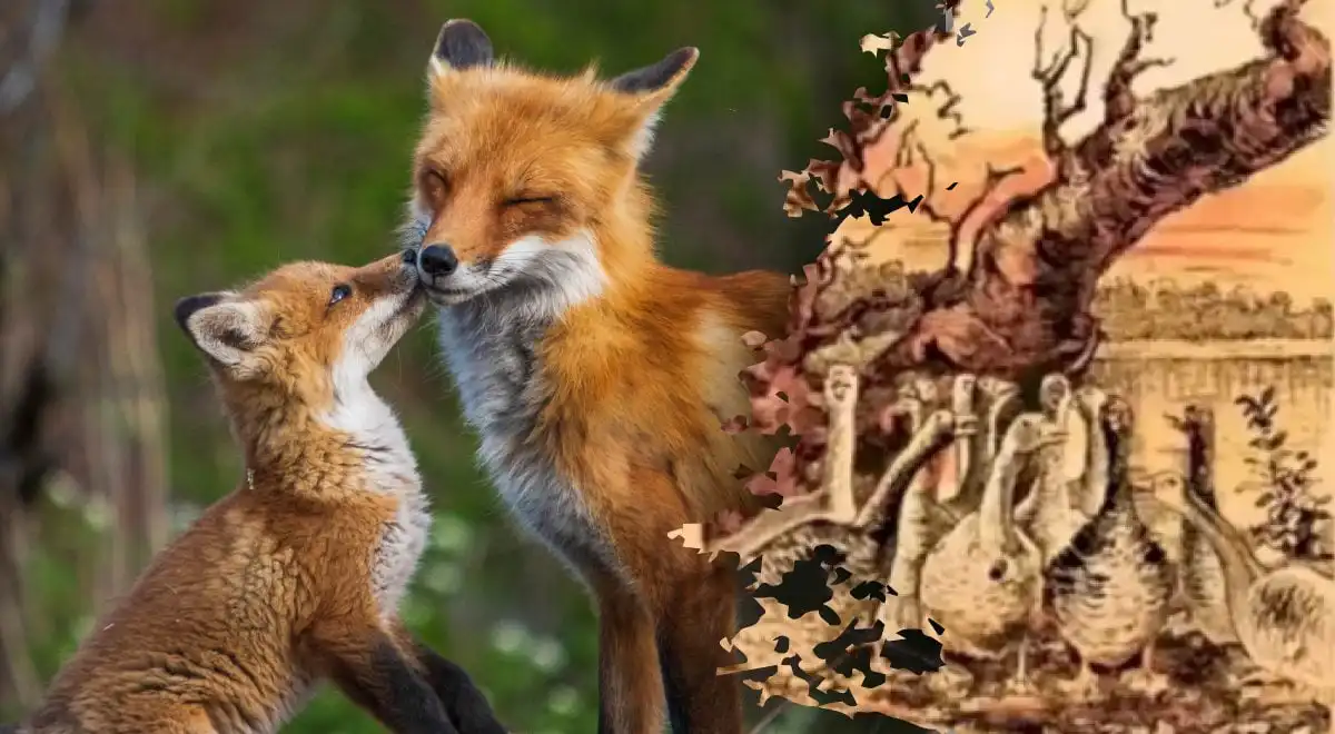 Nu till lösningen. Räven är inte en separat enhet som sitter bland gässen. Den är trädet – eller rättare sagt, den bildas av det tomma utrymmet och skuggorna mellan trädgrenarna. Om du tittar på den övre högra delen av bilden, ovanför gässens huvuden, ser du en samling grenar. I denna virvel av trä, precis till höger om centrum, formar de ljusa och mörka områdena konturerna av ett djurhuvud med spetsiga öron som pekar uppåt och en lång, smal nos som pekar åt vänster. Det är rävens ansikte i profil, kamouflerat som en del av naturen. Se bilden nedan för avslöjandet.
