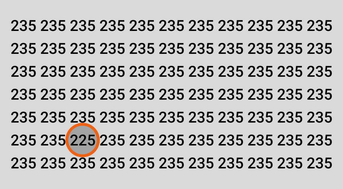 Bland ett hav av siffror 235 gömmer sig ett enda annorlunda tal – 225. Uppgiften är att hitta det på bara 8 sekunder. Nyckeln är att inte stirra sig blind, utan att låta blicken systematiskt söka av bilden efter ett avvikande mönster.
