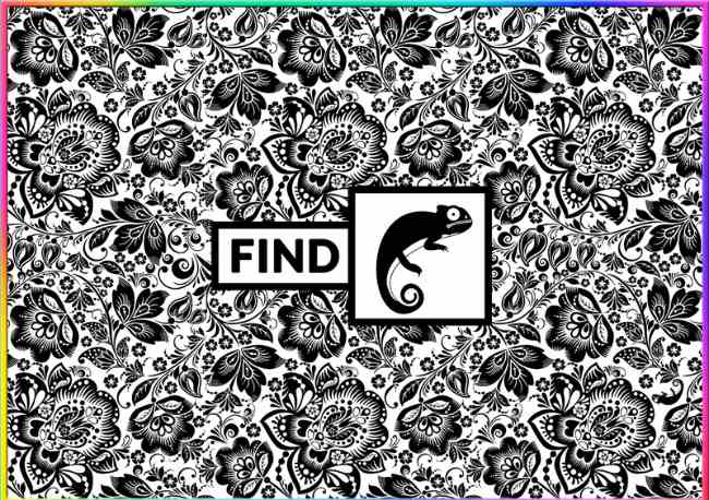 – Försök att inte stirra. Låt blicken slappa över hela bilden utan fokus. Ibland dyker det dolda upp i periferin. – Tänk på en kameleonts typiska profil: en karakteristisk, kupad rygg, en spetsig nos och ofta en ringlande svans. – Leta inte efter en ”färg”. Leta efter en kontur eller en form som bryter mot de omgivande mönstrens flöde. Leta efter en form som ser ut som ett litet, krypande djur, inte som en del av blomstermönstret.
