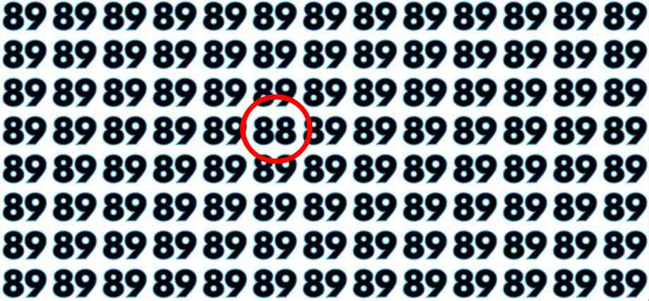 Lösningen är att det ”annorlunda” numret är 88. I ett hav av ”89”:or har en cell istället två åttor. För att hitta det måste du aktivt motverka din automatiska grupperingsprocess och istället aktivt skanna och jämföra varje enskilt tecken. Den som lyckas har enastående visuell uthållighet.