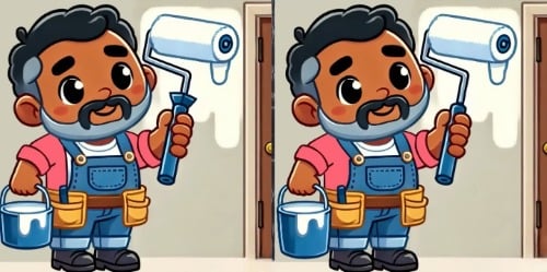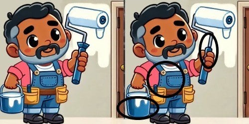 Har du gett upp? Låt oss gå igenom lösningen steg för steg. Om du tittar på arbetarens skjorta, så har fickan på hans bröst försvunnit i den högra bilden. Det är den första skillnaden. För den andra, titta på den gula väggen precis ovanför stegen. I den vänstra bilden finns det en liten, omålad, vit trekantig form. I den högra bilden är denna vita form fylld och målad gul, så den har en annan kontur. Slutligen, för den tredje skillnaden, titta längst ner till vänster i bilden. På golvet, bredvid hinken, finns en liten mörk fläck eller skugga i den vänstra bilden som inte finns i den högra.