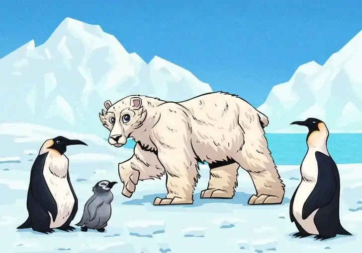 På bilden ser vi en isbjörn och pingviner tillsammans på isen, en scen som verkar naturlig för polara djur. Men det finns ett fundamentalt fel i denna idylliska scen – ett fel som handlar om geografi och inte om visuella detaljer. För att lösa detta pussel behöver du tänka på var dessa djur faktiskt lever i verkligheten.