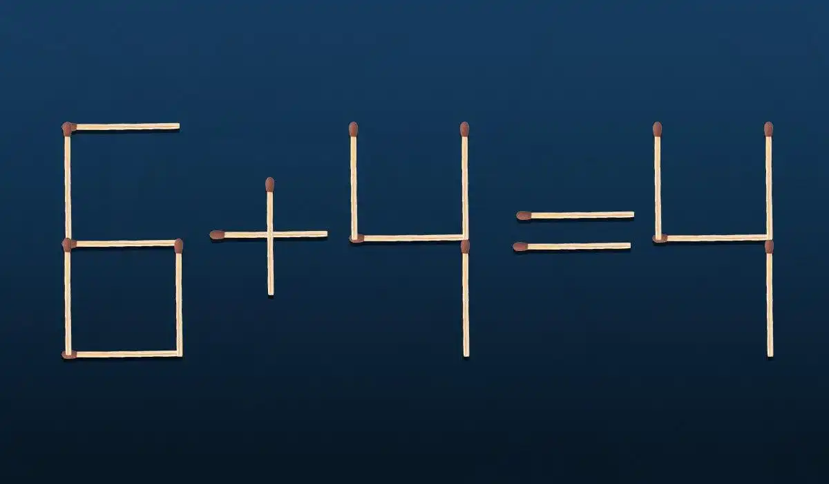 Det här är ett klassiskt tändstickspussel där den felaktiga ekvationen 6+4=4 ska bli korrekt genom att bara flytta en enda tändsticka. Det fina är att det finns inte bara ett, utan hela tre olika sätt att lösa det på. Nyckeln ligger i att tänka kreativt på siffrorna och tecknet, inte bara på summan.