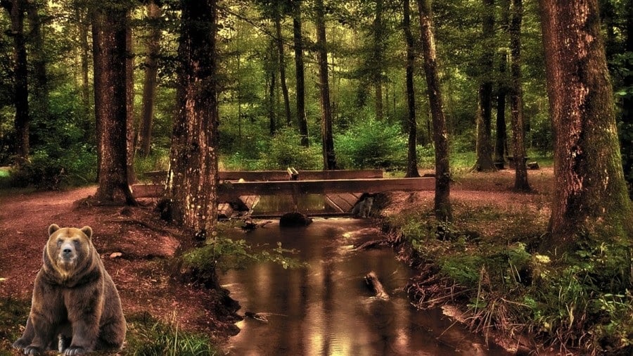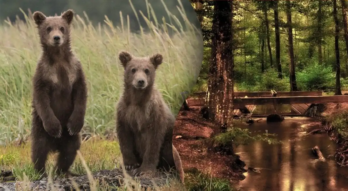 Det här är en klassisk visuell sökuppgift som testar din uppmärksamhet och förmåga att bryta igenom föreställningsförmåga. Bilden visar en vacker, men mycket detaljrik, skogsscen med en flod. En stor björn sitter i förgrunden och ser ut att leta efter något – sin unge. Uppgiften är enkel att förstå men utmanande att utföra: hitta björnungen innan tiden tar slut.