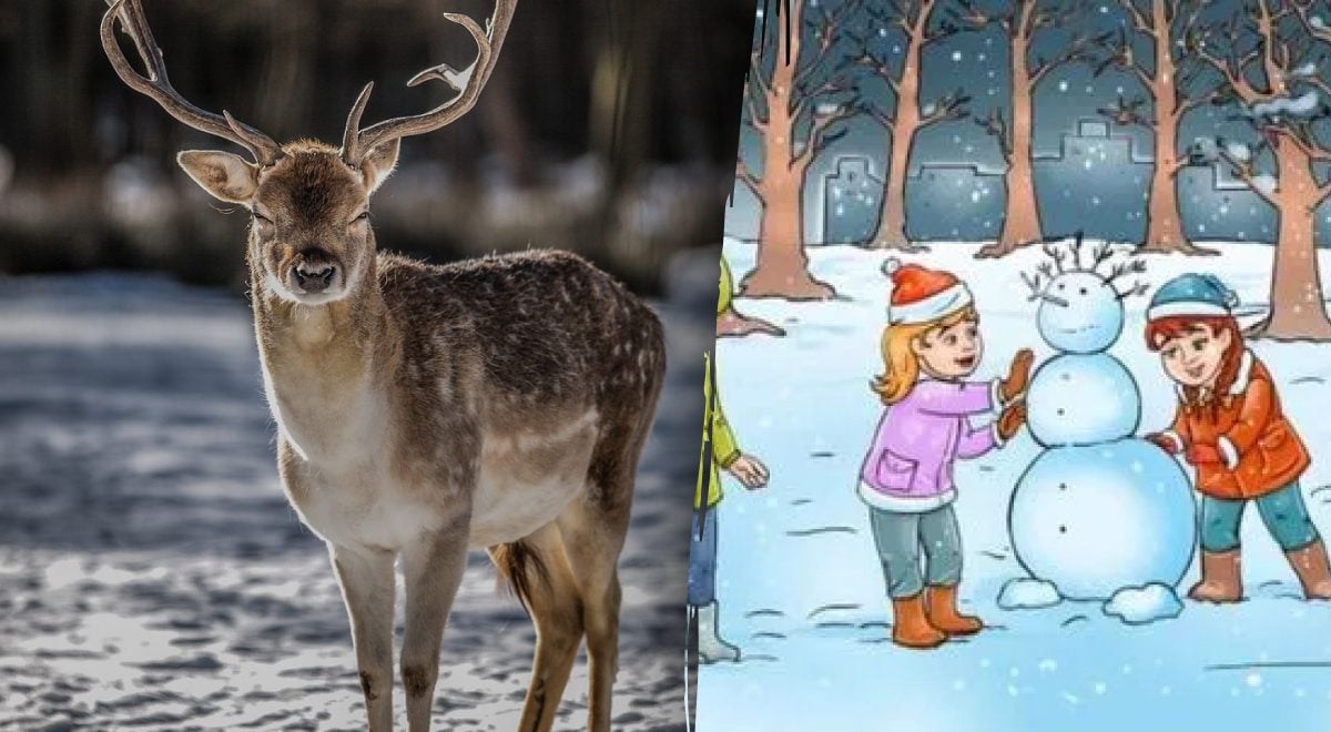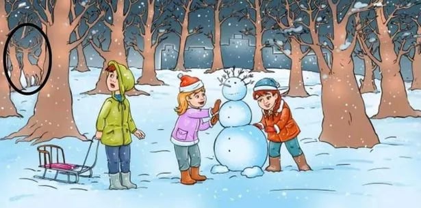 Vinterlandskapet är fullt av liv: tre barn som bygger snögubbe, en pulka och tallar täckta av snö. Men någonstans i denna idylliska scen har en liten rådjurskalv gömt sig. Uppgiften är en klassisk visuell pussel där uppmärksamhet och perceptuell flexibilitet sätts på prov. Många fastnar för de stora, centrala objekten – barnen och snögubben – och missar därför den lilla varelsen som smälter in med omgivningen. Det handlar om att se det som inte genast vill synas.