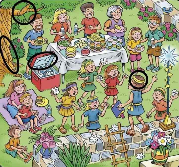 För att hitta kuvertet, titta på den rödrandiga skjortan på mannen till vänster. Det rektangulära kuvertet är skickligt gömt som en del av skjortans mönster, med sin kant synlig. Moroten gömmer sig i den ljusblå klänningen på kvinnan i mitten av bilden; den är placerad lodrätt och formar en del av klänningens design. Den gula bananen finns i den blommiga klänningen på flickan till höger, integrerad bland blommorna. Slutligen sitter fjädern elegant som en dekorativ detalj i den blonda flickans hårfäste till vänster. Varje föremål utnyttjar sin omgivnings textur för att smälta in, vilket kräver en skarp och analytisk blick för att upptäckas.