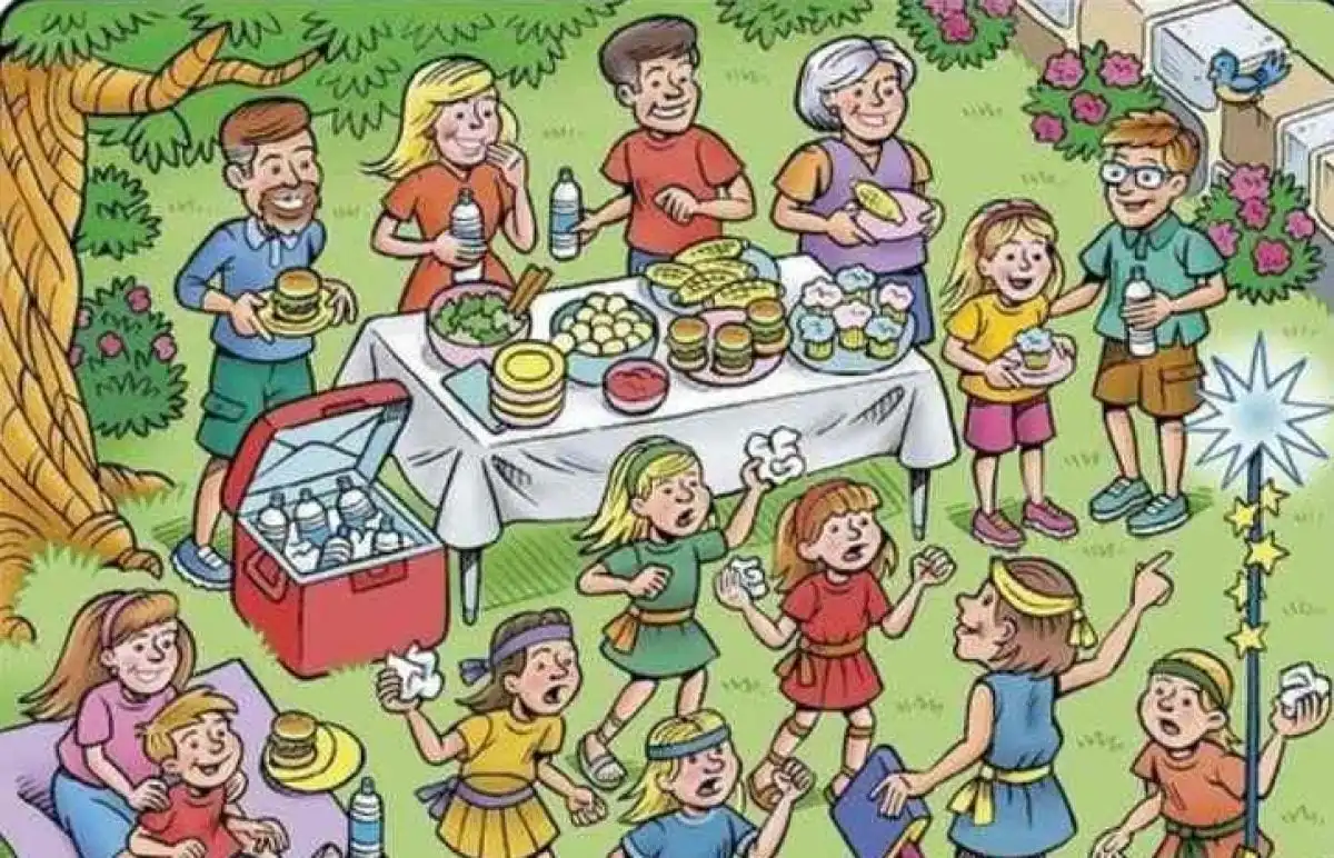Det är en solig dag och en stor familj har samlats för en livlig picknick. Barnen springer och leker, de vuxna dukar bordet. I all denna rörelse och glada oreda har fyra föremål gömts med skicklighet. Uppgiften är enkel att förstå, men svår att utföra: hitta ett kuvert, en morot, en banan och en fjäder innan de 20 sekunderna har runnit ut. Det handlar inte bara om skarpa ögon, utan om att kunna filtrera bort bruset och fokusera på det väsentliga. Är din hjärna redo för utmaningen?