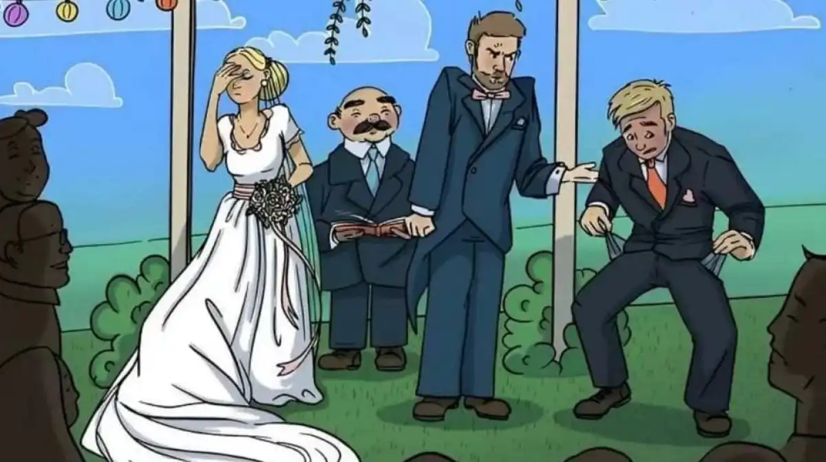 Bröllopet har tagit en dramatisk vändning. Bruden ser förtvivlad ut och brudgummen konfronterar ett vittne med en anklagande min. Anledningen? Den värdefulla vigselringen har försvunnit mitt under ceremonin. Vittnet håller upp sina tomma händer i en gest av oskuld. Din uppgift, som observatör med skarpa ögon, är att hitta ringen innan bröllopskaoset eskalerar ytterligare. Du har bara fem sekunder på dig – är din hjärna redo för utmaningen?