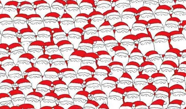 Ett får är skickligt kamouflerat bland en skara jultomtar, och utmaningen är att hitta det på bara sju sekunder. Nyckeln är att inte fokusera på detaljerna i varje tomte, utan att låta blicken svepa över hela bilden för att upptäcka ett avvikande mönster.