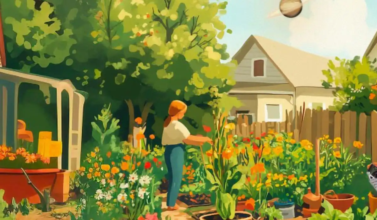 Lösningen ligger i tre stora felaktigheter. För det första växer det bananer i rabatten längst fram. Bananer växer på stora örter i tropikerna, inte som små buskar i en tempererad trädgårdsrabatt. För det andra håller kvinnan i en stekspade – ett rivjärn – men vattnar blommor med den som om det vore en vattenkanna. Det tredje och kanske mest slående felet är på himlen. Istället för solen eller månen hänger planeten Saturnus med sina karakteristiska ringar tydligt synliga på den blå himlen. Dessa tre saker gör scenen omöjlig i vår verkliga värld.